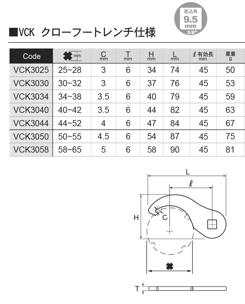 ASAHI VCK3034 引掛タイプ クローフートレンチ 差込角9.5mm φ34-38 ASH アサヒ 旭金属工業