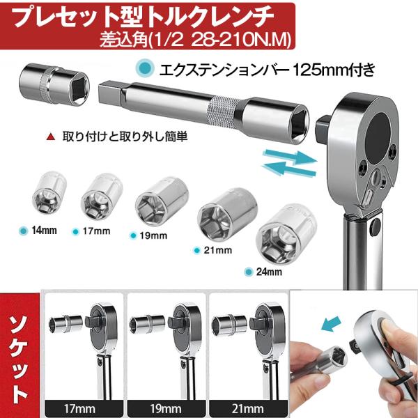 トルクレンチ 自動車 タイヤ交換 ソケットセット プレセット型 専用ハードケース付き ホイール交換28-210N・m 14/17/19/21/24 延長アダプタ ラチェット