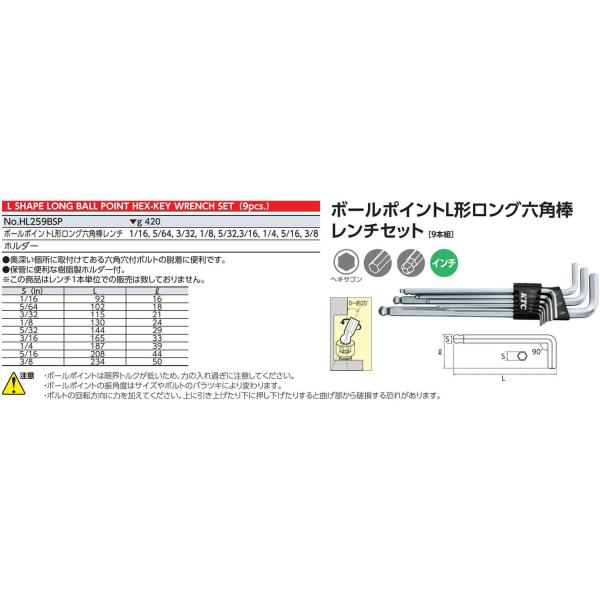 京都機械工具(KTC) ボールポイント L型 ロング六角棒レンチ セット 9本組 HL259BSP