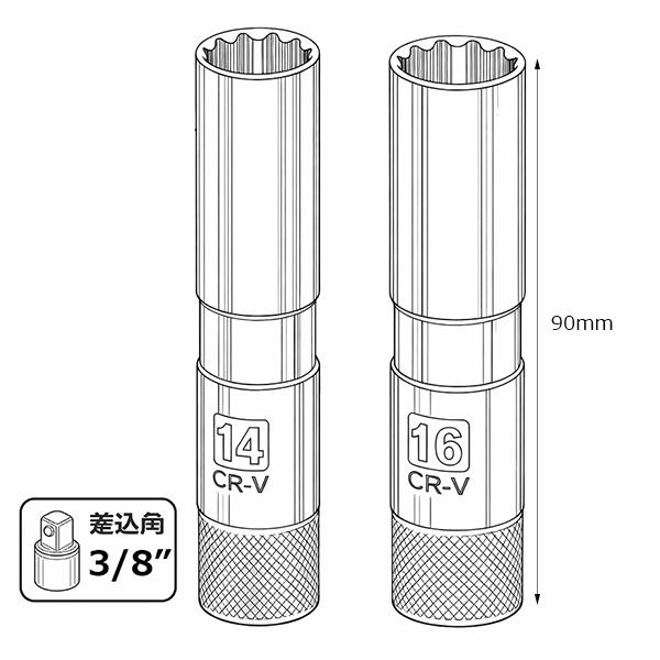 ロングタイプ プラグレンチ 2本セット 14mm 16mm(12角 マグネット付き)T352