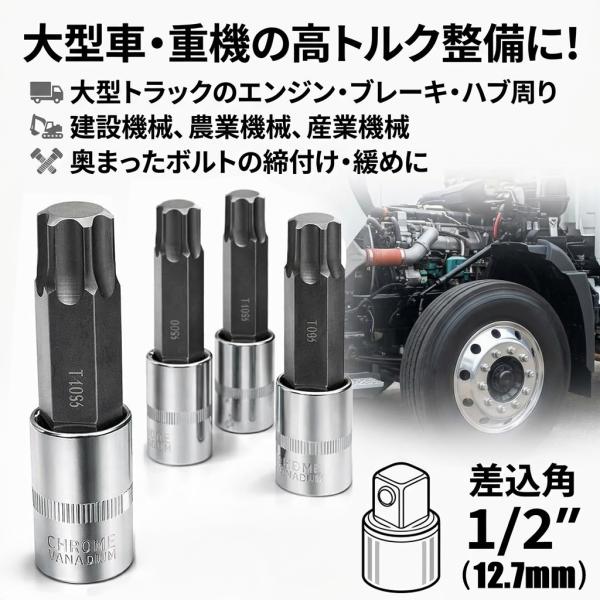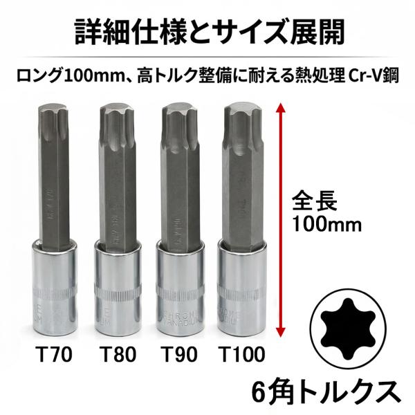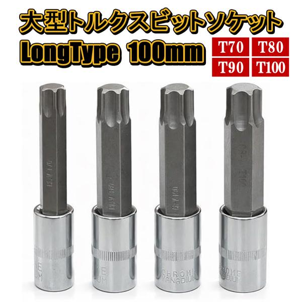 トルクスビットソケット セット 大型サイズ ロングタイプ T70 T80 T90 T100 4本組 6角 花形 星型 ソケット トラック用 12.7mm 1/2 100mm シリンダーヘッドボルト