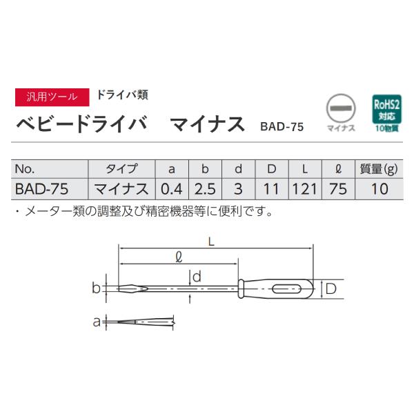 KTC BAD-75 ベビードライバー 2.5mm幅マイナス 先端幅 2.5mm 先端厚 0.4mm【ネコポス対応】