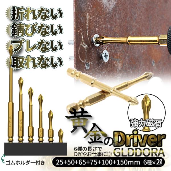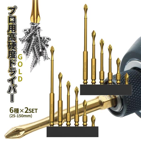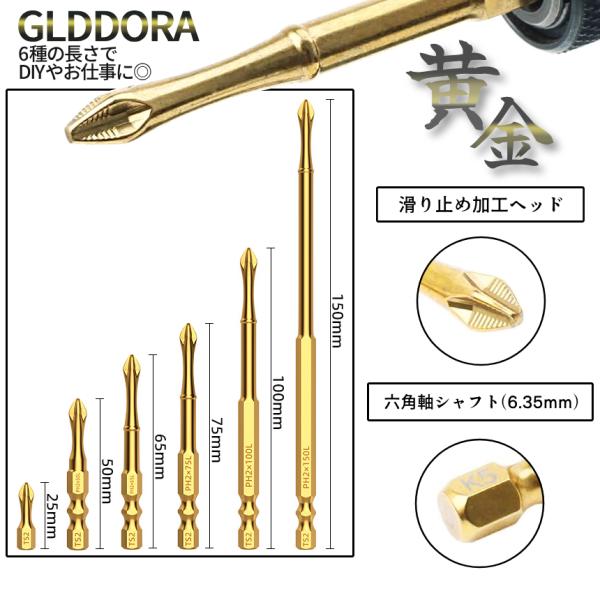 金色 ドライバー ビット 6種 2pcsセット 25mm-150mm 輝く プラスドライバー 黄金 GOLD 六角軸 ネジ 電動 ドライバー インパクト 工具 DIY 2-GLDDORA