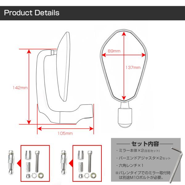 バイク ミラー バレンミラー バーエンドミラー ブラック シルバー ポリゴン型 2WAYミラー 左右セット S-699