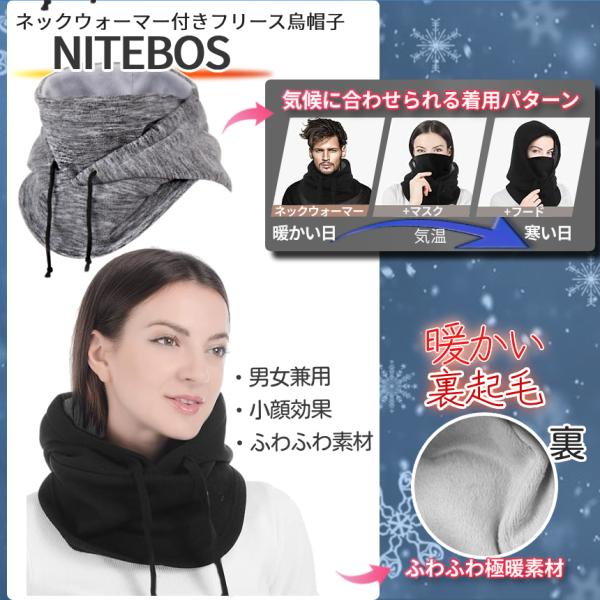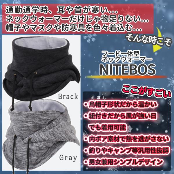 ネックウォーマー メンズ レディース フードウォーマー フード付き 防寒 ネック フード 暖か 寒さ対策 首 マフラー ブラック グレー 冬 スノボー ウェア NITEBOS