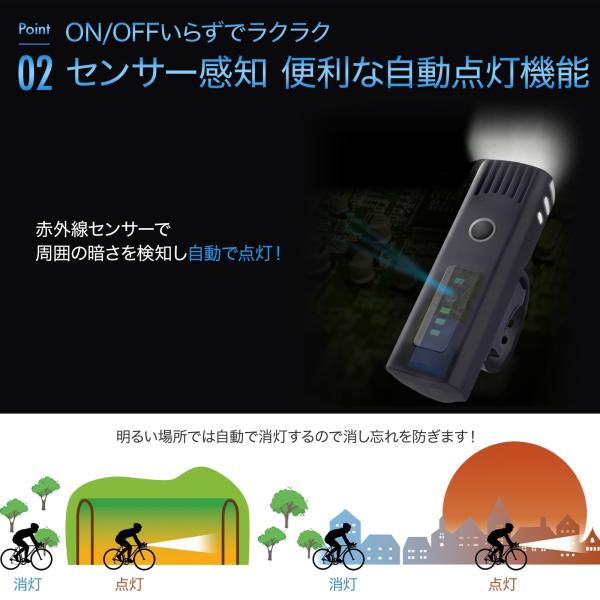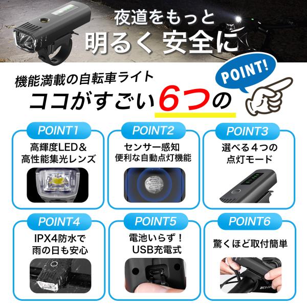 自転車 ライト 自転車ライト usb充電式 サイクルライト センサー 最強 強力 後付け 明るい led 自動点灯 ホルダー付 オートライト 防水 軽量