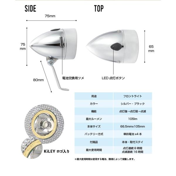 KiLEY キーレイ ライト LM-001 Retro Metal Bicycle Light / Silver 砲弾ライト レトロ メタル 自転車 バイシクルライト フロント用