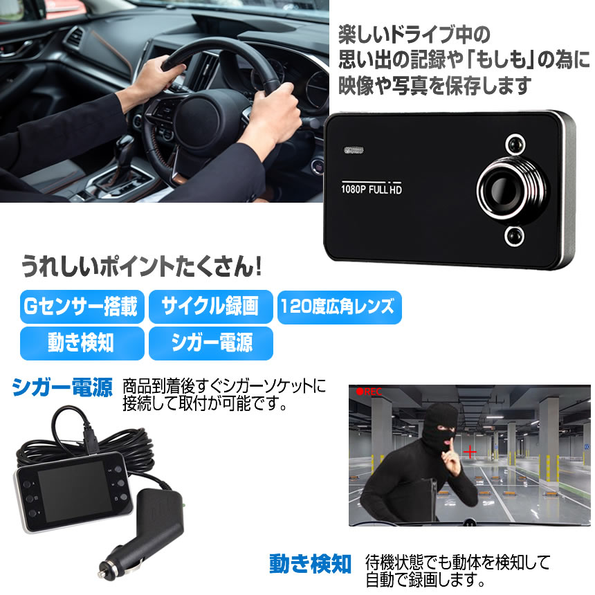 ドライブレコーダー 12V ドラレコ シガー電源 1080P Gセンサー サイクル録画 補助ライト付 広角レンズ 小型 100度 コンパクト 事故 駐車監視 動体検知 DORAIB