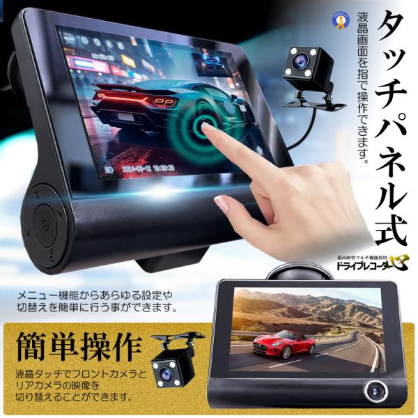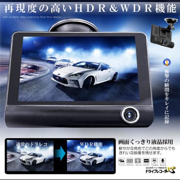 3カメラ搭載 ドライブレコーダー 前後 吸盤式 3カメラ 4インチ 超大画面 タッチパネル式 HDR LCDDORA
