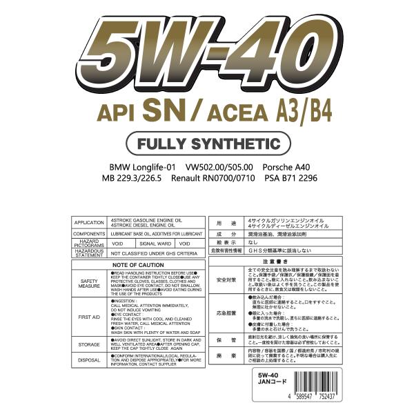 JDA ユーロ エンジンオイル 5W-40 SN A3/B4 20L 全合成基油