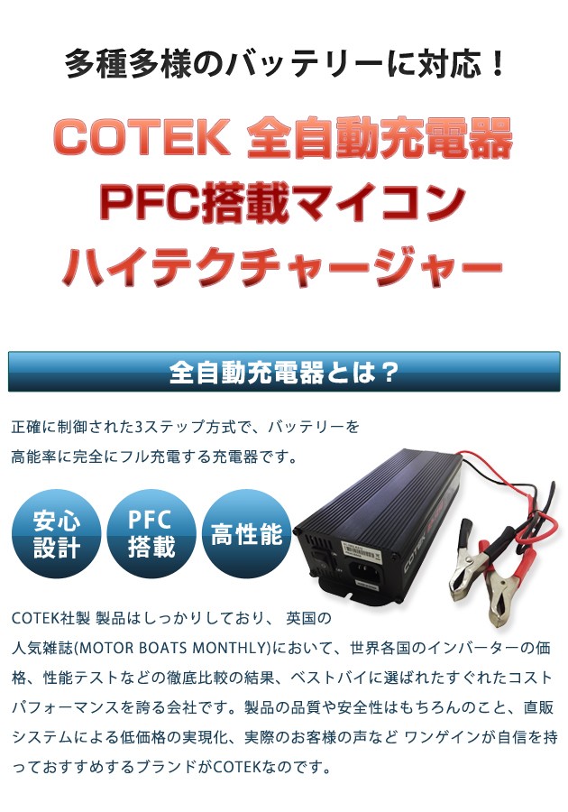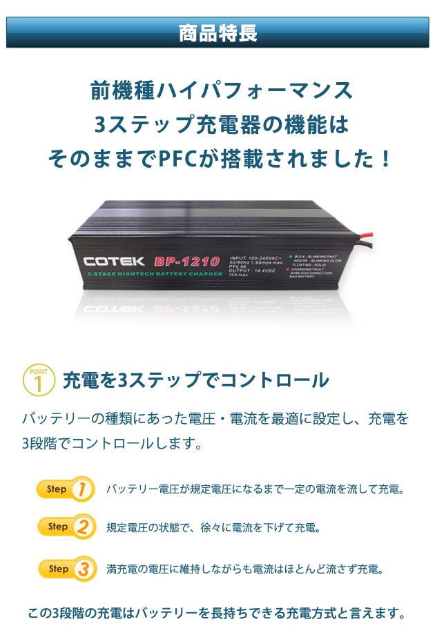 COTEK BP-1210 全自動充電器 最大出力電流10A 出力電圧12V PFC搭載マイコンハイテクチャージャー コーテック サブバッテリーチャージャー