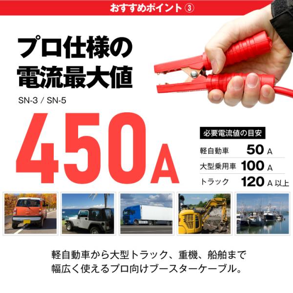 ブースターケーブル 業務用 圧倒的な始動性能! 極太 3.5m 450A/直径10mm(SN-3) 12V/24V車対応 軽自動車・普通自動車・重機・船舶・大型トラックなど