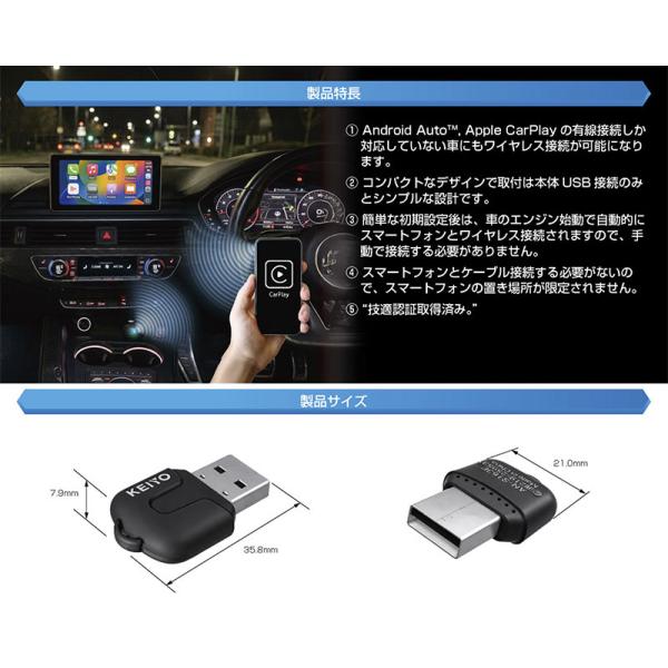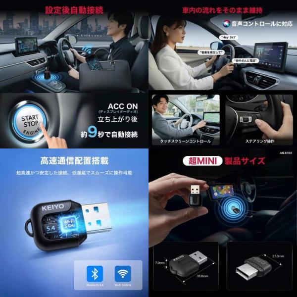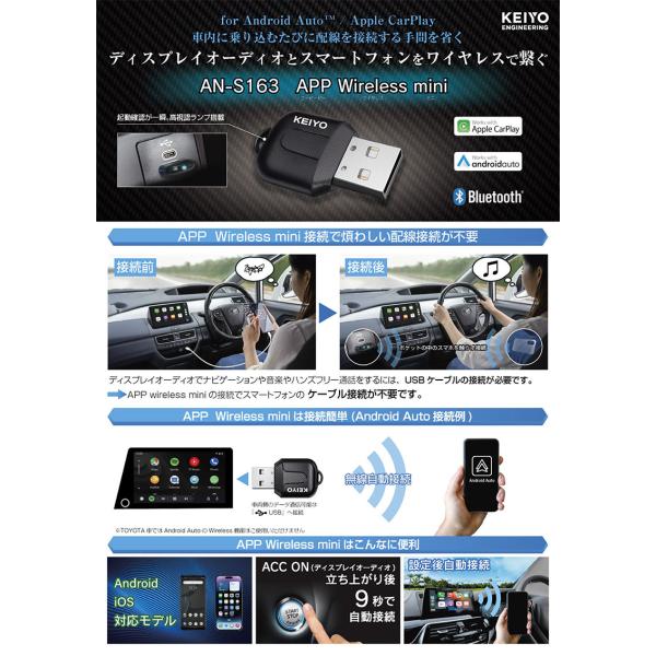 KEIYO AN-S163 APPワイヤレスmini ケイヨー Apple CarPlay / Android Autoワイヤレスアダプター 無線化 Bluetooth 5.4 & Wi-Fi 6対応