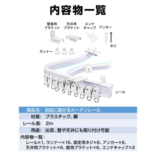 カーテンレール 長さ 2m 手で折り曲げられる アジャスタブル 曲がる 静音 取り付け可能 DIY 部品付属 長さカット可 車 軽トラ トラック 車中泊 仮眠 休憩 日除け