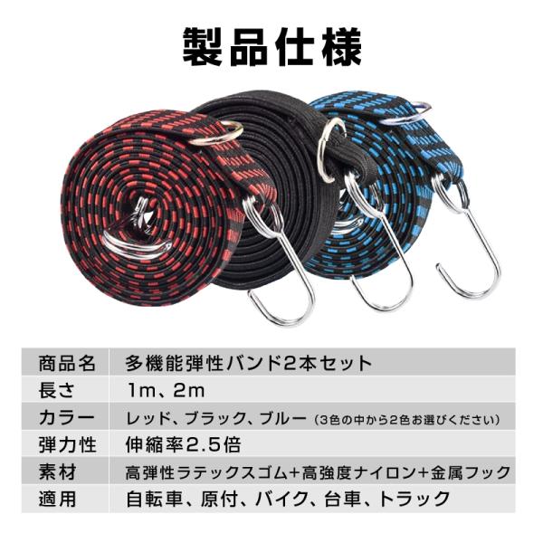 高弾力 バンド 2本セット 強力 荷台 荷物固定 長さ 1m 2m 伸縮 幅3cm 丈夫 フック付き ゴム 紐 ロープ 自転車 バイク 軽トラ 台車 固定 荷造り 荷締め 引っ越し
