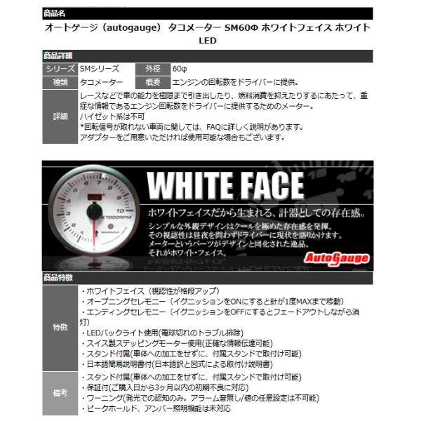オートゲージ タコメーター SM60Φ ホワイトフェイス ホワイトLED