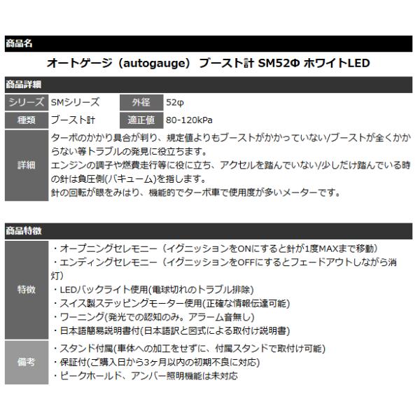 オートゲージ ブースト計 SM52Φ ホワイトLED ワーニング メーターフード付