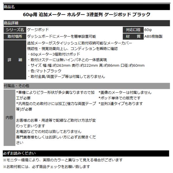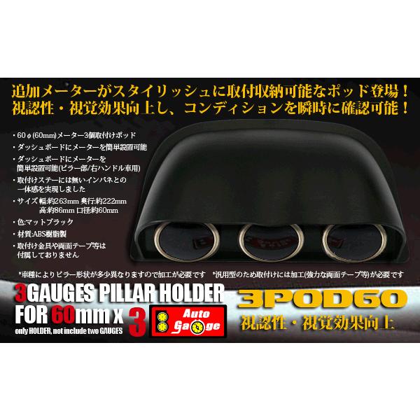 オートゲージ 60φ用 追加メーター ホルダー 3連並列 ゲージポッド ブラック