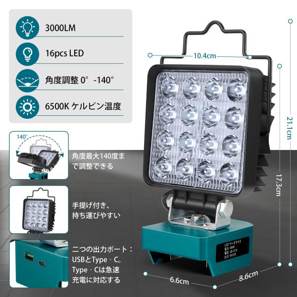 マキタ 18V ライト 充電式 ワークライト LED フラッドライト コードレス作業灯 投光器 48W 3000LM IP65防水 手提げ付 USB Type-C充電 一年保証(バッテリー別売)