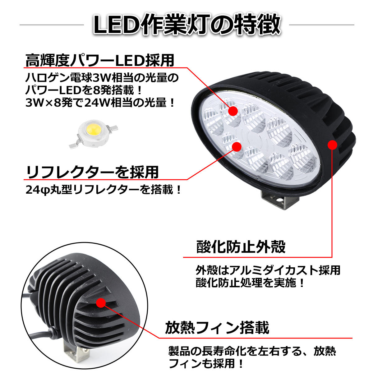 【2個セット】 LED ワークライト 作業灯 ライト 24W 12V 24V 兼用 防水 バイク 車 トラック フォグランプ バックランプ 補助灯 カスタム パーツ PZ177-2SET