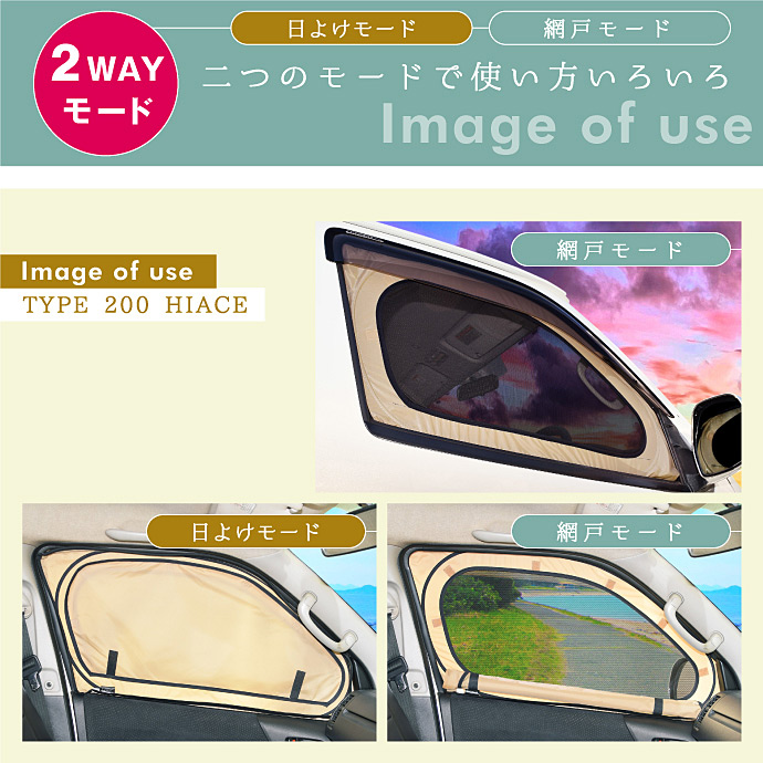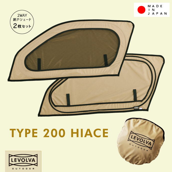 ハイエース 200系 2WAY網戸シェード フロントドアガラス用|車用網戸 虫よけ 日よけ ウィンドーバグネット 車用メッシュネット 車中泊グッズ|LEVOLVA OUTDOOR