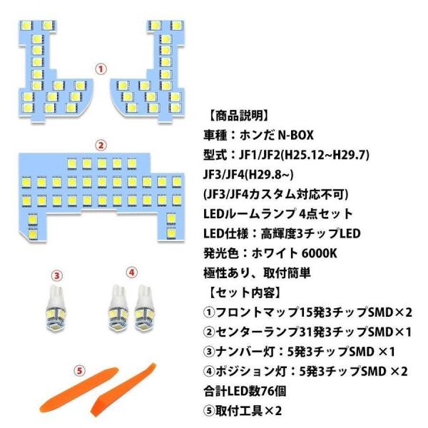 LEDルームランプ ホンダ N-BOX用 ホワイト 室内灯 JF1 JF2 JF3 JF4 JF5 JF6 専用設計 爆光 車用 カスタムパーツ JF3/JF4カスタム対応不可 バルブ 内装パーツ