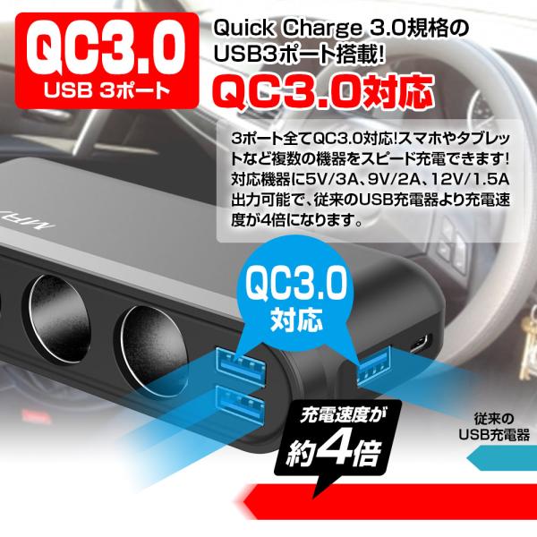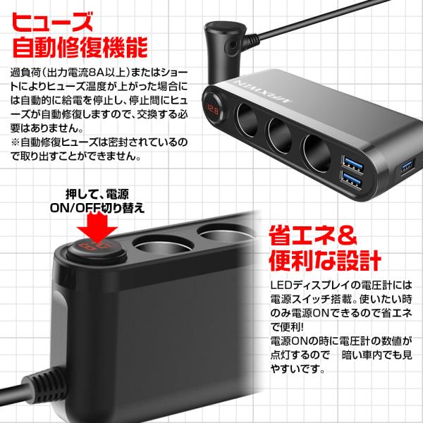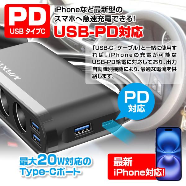 シガーソケット 3連 12V 24V カーチャージャー PD 20W Type-C QC3.0 iPhone15 iPad pro Android