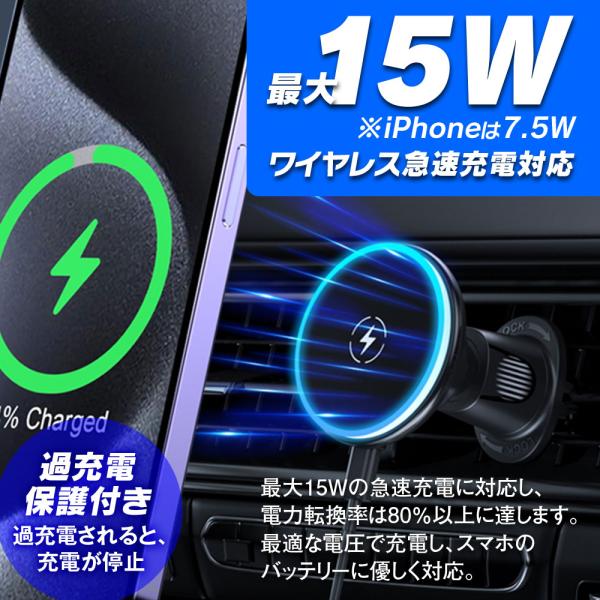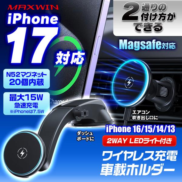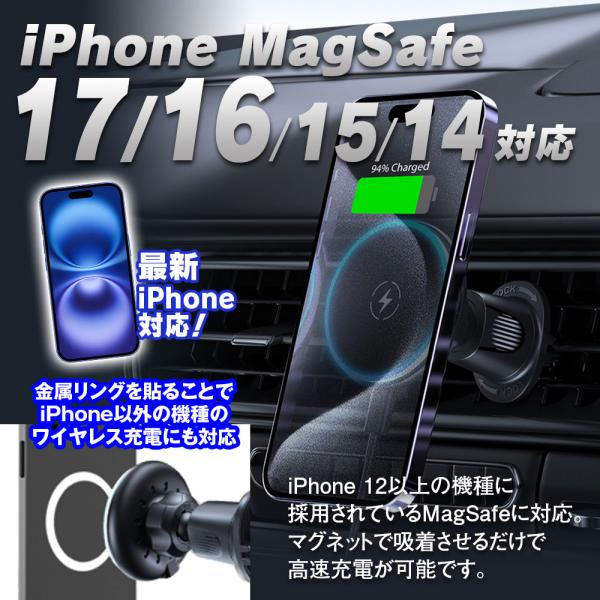 車載ホルダー ワイヤレス充電器 magsafe 車 充電 マグセーフ マグネット スマホホルダー iPhone17 iPhone16 スマートフォン