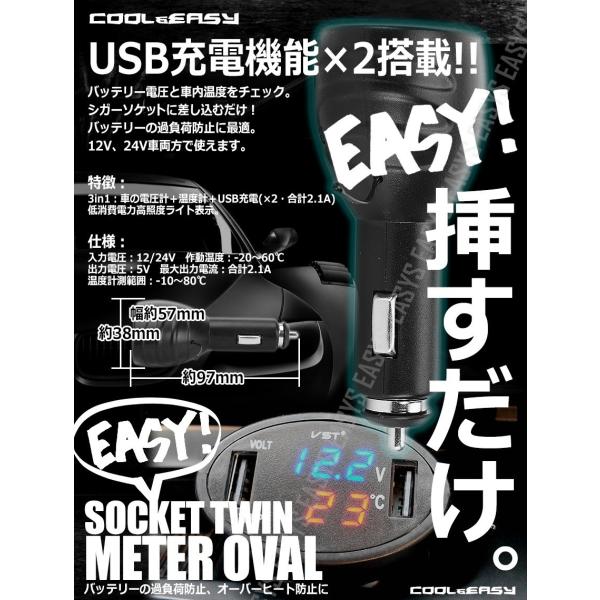 電圧計 温度計 液晶 シガー 充電器 USB バッテリー 12V 24V スマホ ソケット ツイン メーター