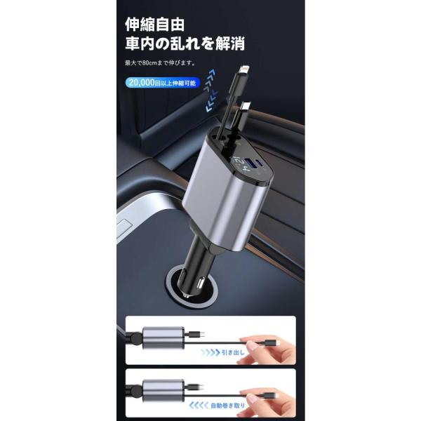 【今だけ100円引き!低温急速充電】シガーソケット 4台同時に充電 延長 巻き取り リール式 車 Type-C Lightning 急速充電器 4ポート カーチャージャー 12V/24V車