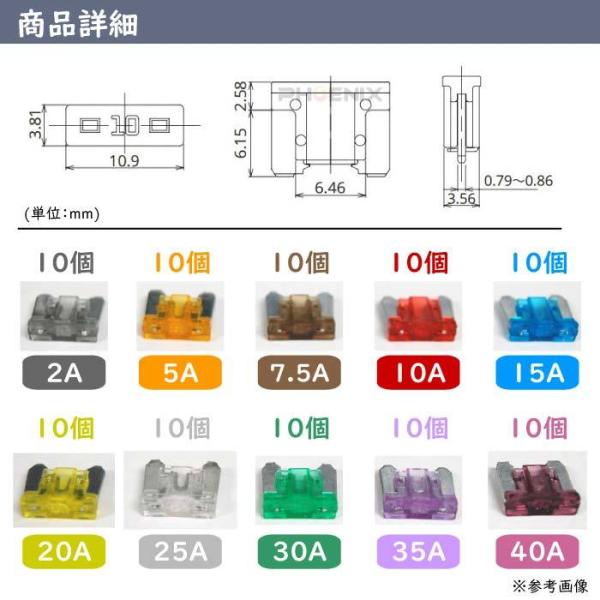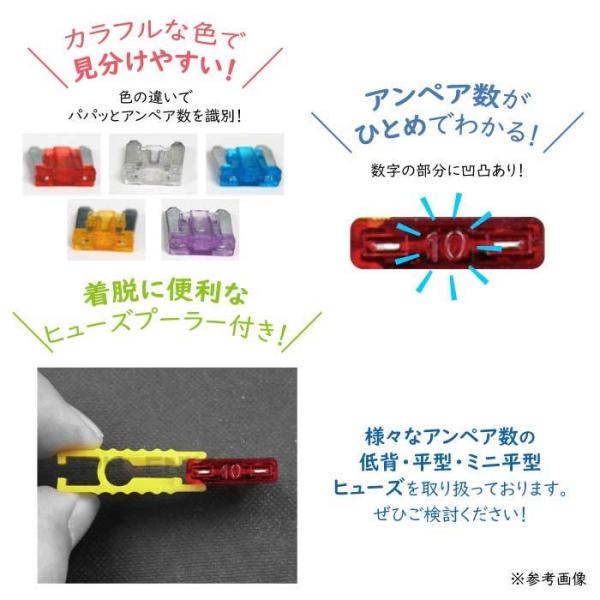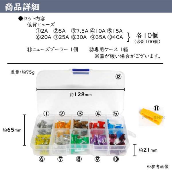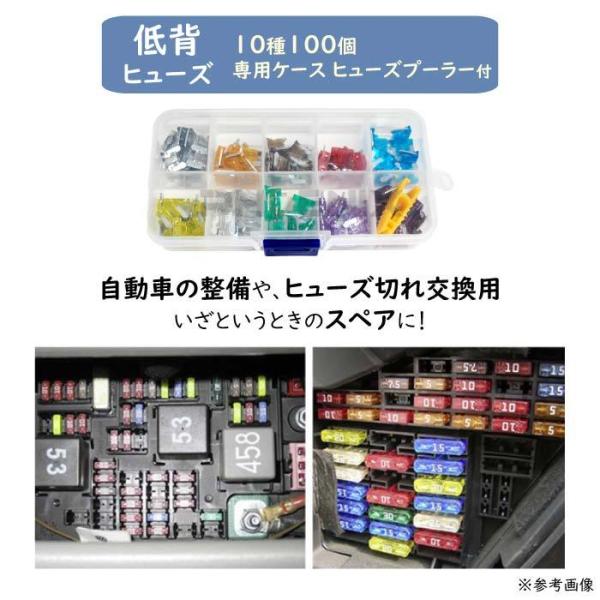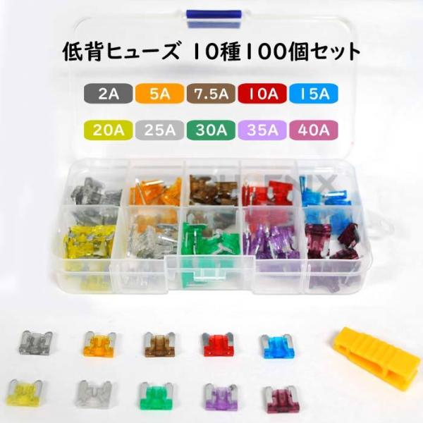 低背ヒューズ 100個セット 10種 ヒューズクリップ ケース付 ヒューズプーラー付 着脱工具 2A 5A 7.5A 10A 15A 20A 25A 30A 35A 40A 車 汎用 交換