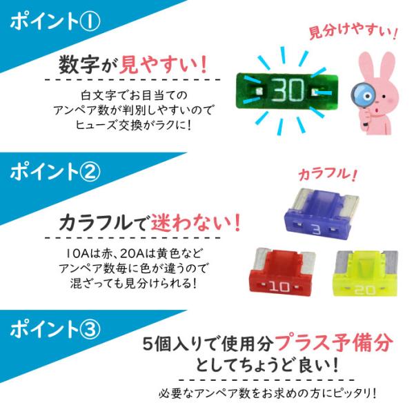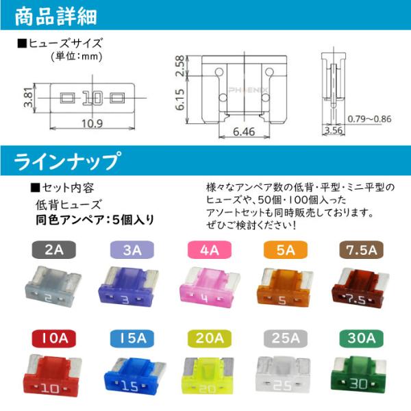 ヒューズ 低背 ブレード 選べる 1種 5個 セット 車 カー バイク 電装 ヒューズBOX 白文字 2A 3A 4A 5A 7.5A 10A 15A 20A 25A 30A 緊急 交換 安全 応急処置