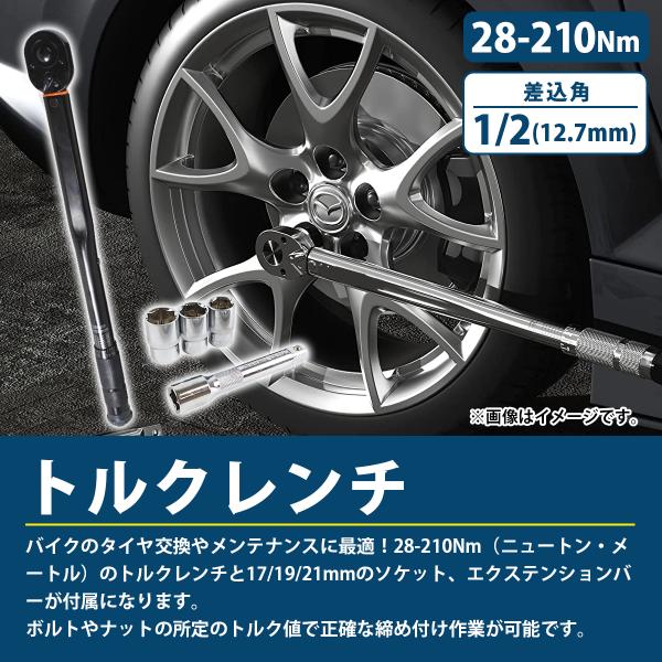 28-210Nm トルクレンチ セット 1/2インチ(12.7mm) 14mm/17mm/19mm/21mm ソケット エクステンションバー 車 バイク 点検 整備