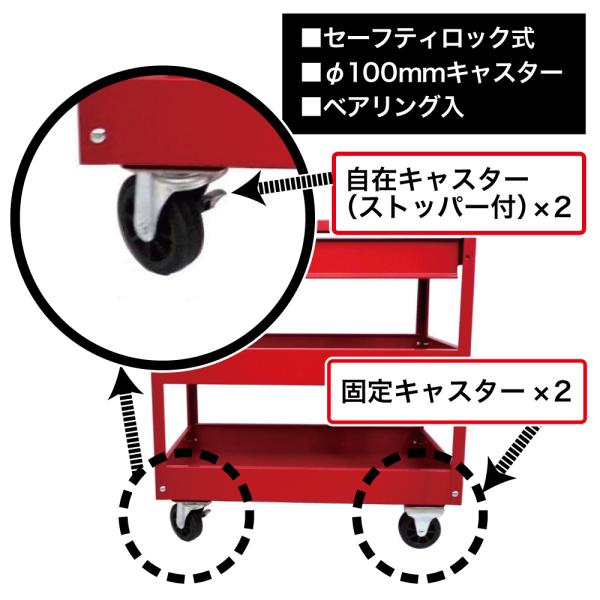 一段引出し付ワゴン TC301-2X 工具箱 ワゴン キャスター ストッパー セーフティーロック 収納 点検 整備 作業 レッド 赤