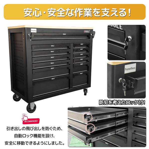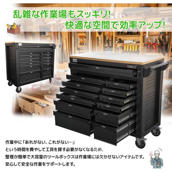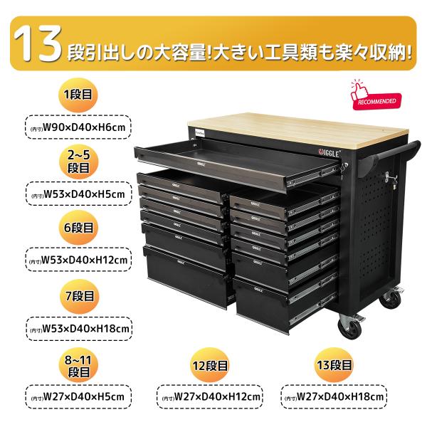 木製天板付き 贅沢13段ツールボックスキャビネット ツールボックス ローラーキャビネット 工具箱 鍵4本付工具収納 キャスター付大型