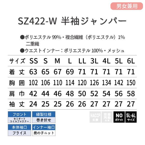 サーヴォ 高温作業 食品工場 白衣 半袖 ジャンパー 暑さ対策 涼しい 調理白衣 食品白衣 衛生白衣 衛生衣 作業着 大きいサイズ 5L 6L サンペックス sv-sz422