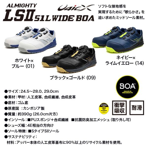 ミズノ安全靴 オールマイティ LSll 51L WIDE BOA F1GA2415 幅広4E ユニセックス ローカット MIZUNO 作業靴 スニーカー セーフティシューズ ダイヤル式 爆買