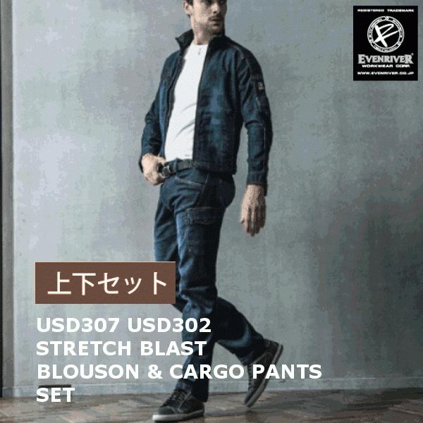 送料無料(但し北海道、沖縄を除く) 上下セット イーブンリバー ストレッチブラストブルゾン パンツ USD307 USD302 デニム 作業服 作業着