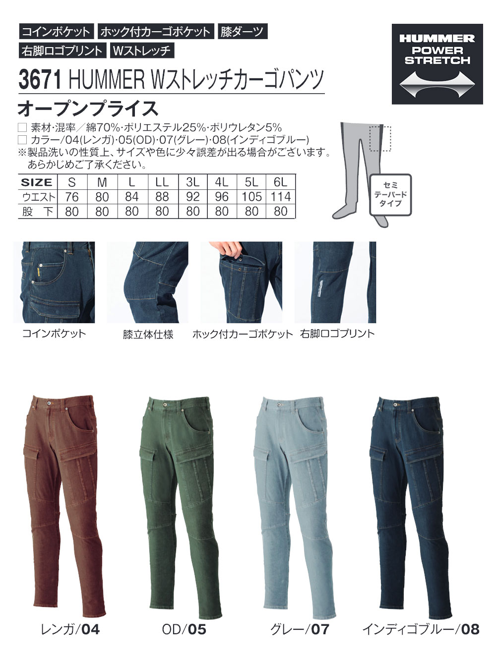 HUMMER 作業服 作業着 ズボン カーゴパンツ メンズ ストレッチパンツ メンズ ワークパンツ 大きいサイズ 作業ズボン デニム ハマー アタックベース 3671 爆買