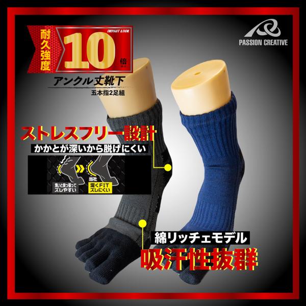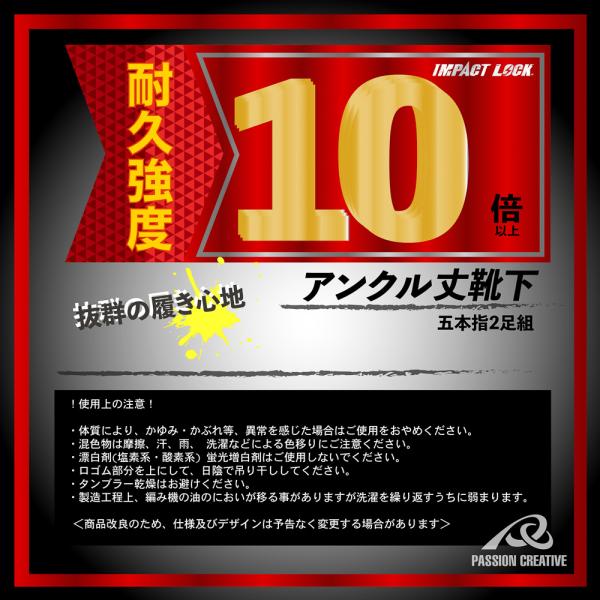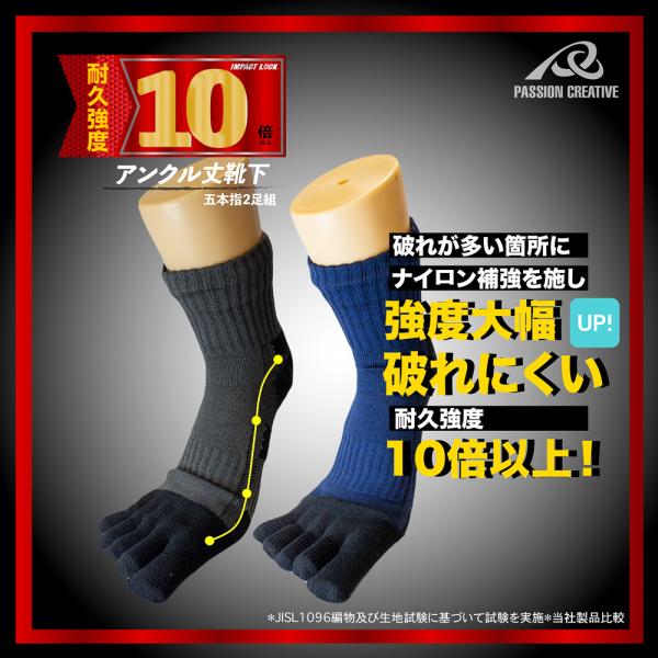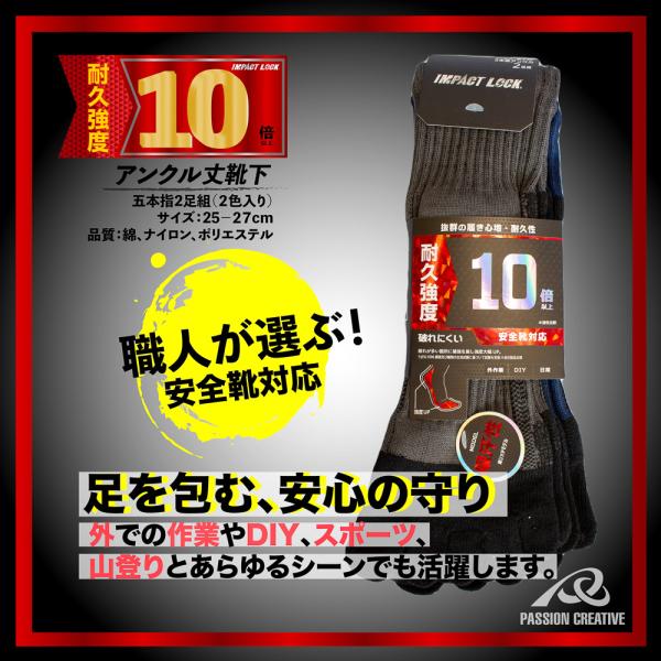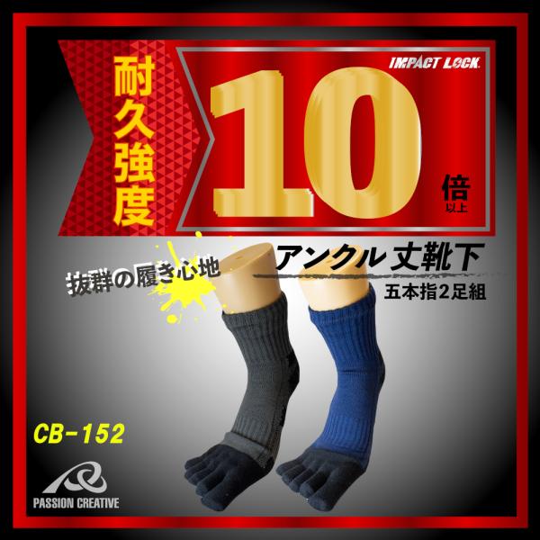 安全靴対応 靴下 メンズ 5本指 アンクル丈 2足組 25-27cm 破れにくい ナイロン補強 耐久強度10倍以上(当社比較) 吸汗 IMPACT LOCK CB-152