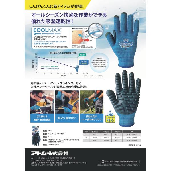 1双送料200円 しんげんくん クール&ドライ アトム 1145 振動軽減防振手袋 タッチパネル対応 日本製 S、M、L 1双 刈払機 チェーンソー