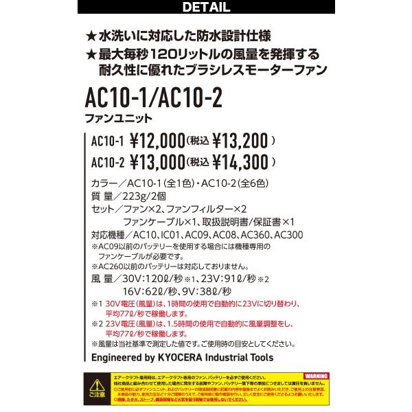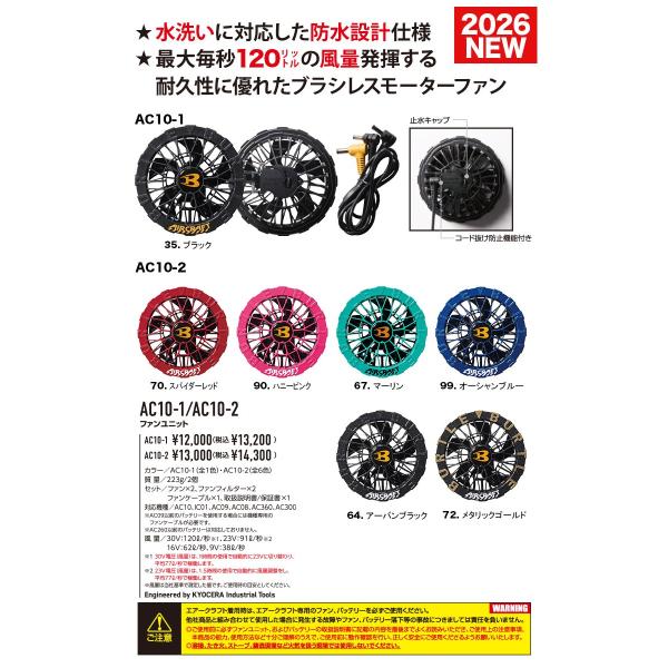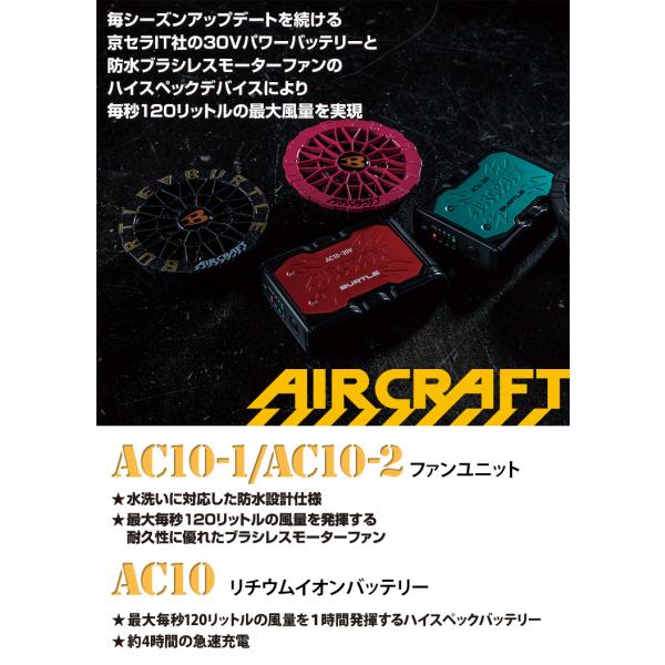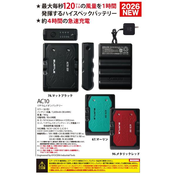 BURTLE バートル エアークラフト 2026年新型 30V リチウムイオンバッテリー/ファンユニットセット AC10&AC10-1/AC10-2 作業服 急速充電 大風量120L 京セラ