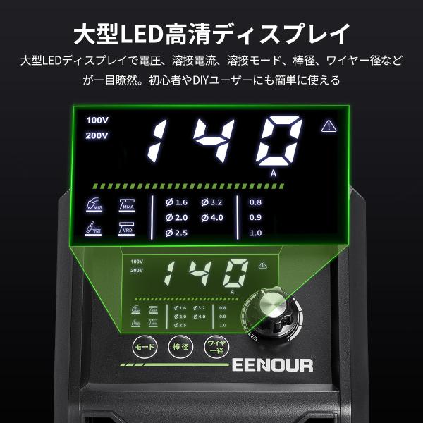 3,000円OFF併用 半自動溶接機 100V 200V 兼用 140A 使用率60% EENOUR MIG140P+ LED高精細表示 自動仕様調整 知能チップ制御 ノンガス ストラップ付き 工事用