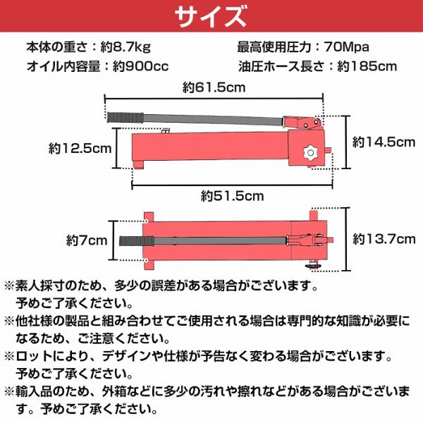 手動式 油圧ポンプ 容量 900cc 最高使用圧力 70Mpa レッド 油圧ホース 185cm カプラ ハンドポンプ 持ち上げ 曲げ 矯正 切断 リベット締め