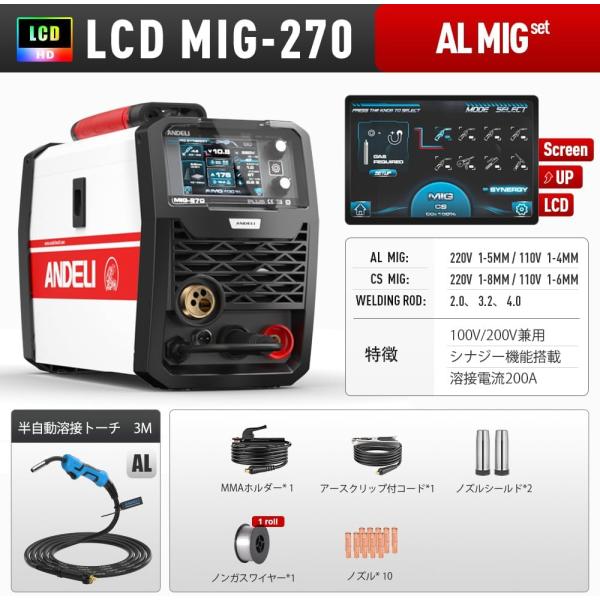 ANDELI 半自動溶接機 アルミ溶接可能 100V/200V 200AMP MIG Lift TIG &アーク溶接 ガス&ノンガス 5 in 1多機能MIG溶接機 LCDスクリーン MIG-270PLUS