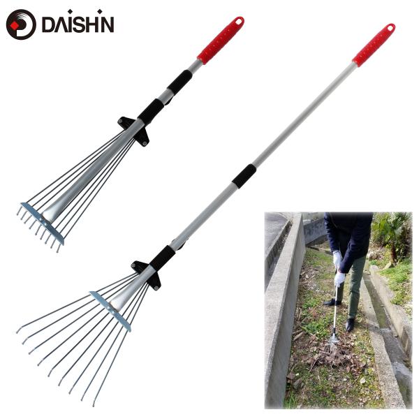 熊手 伸縮 レーキ ほうき ガーデンレーキ トンボ 伸縮式 コンパクト 芝生 落ち葉 草 枝 幅 長さ 調節 農業 庭 掃除 溝かき アルミ くまで 大進