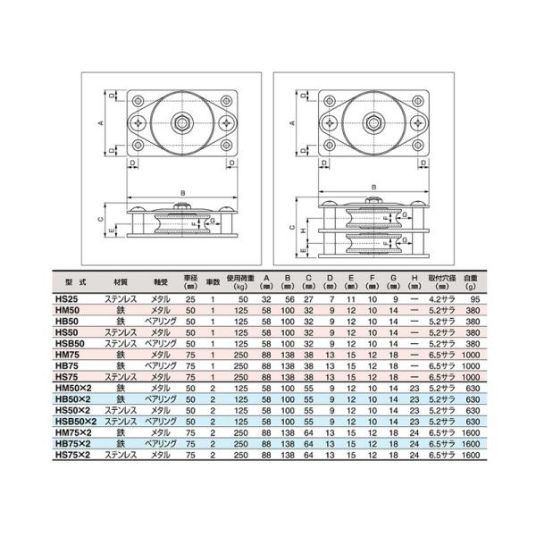 固定滑車よこ型 ステンレス 軸受メタル HS25 車径25mm スリーエッチ HHH 代引不可