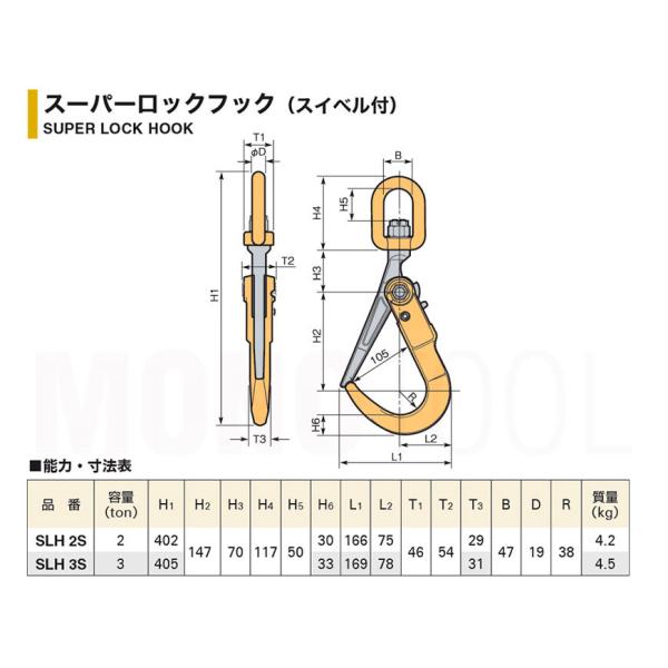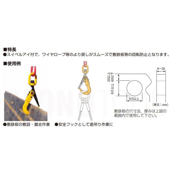 スリング取付け長さを自由に特注 スーパーロックフック スイベル付 SLH3S 使用荷重3t 敷鉄板吊りフック スーパーツール