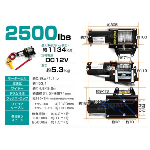 電動ウインチ 車両用 12v 2500LBS 1134kg 電動ホイスト 12V 有線コントローラー付 チェーンブロック