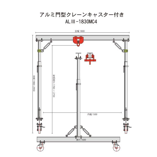 アルミ門型クレーン軽量組立式 キャスター付490KG W1800 日本製(法人様のみ配送可)